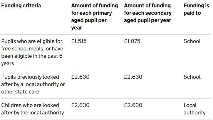 | Pupils in year groups reception to year 11 recorded as Ever 6 Service Child or in receipt of a child pension from the Ministry of Defence | £340 |